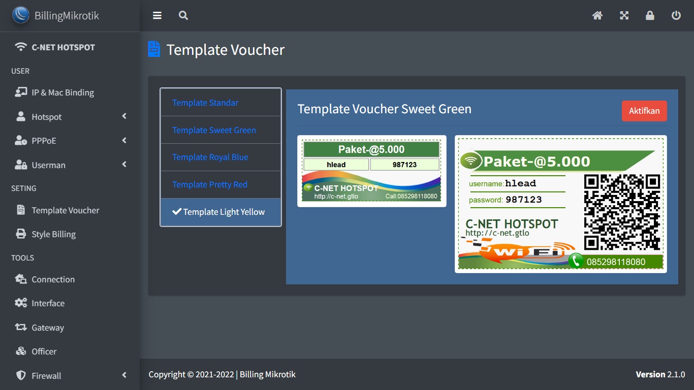 - Ditambahkan menu seting & edit Template Voucher, dengan aneka macam desain Template Voucher yg bisa diganti-ganti.