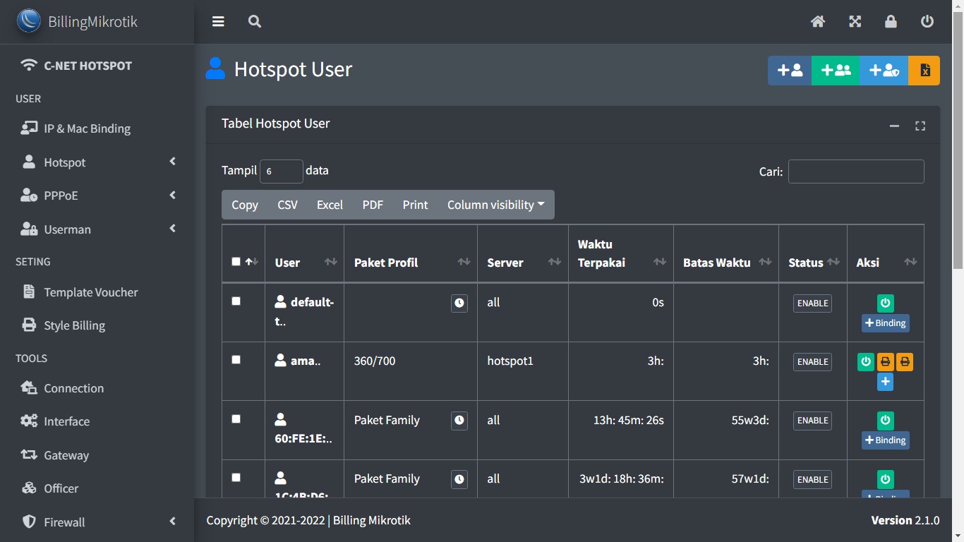 - Tersedia panel seting untuk tambah,edit,hapus,cetak voucher user berdasarkan paket user.