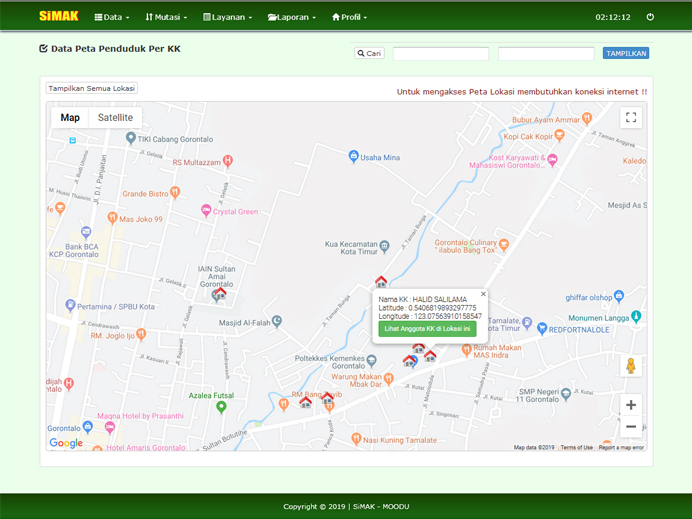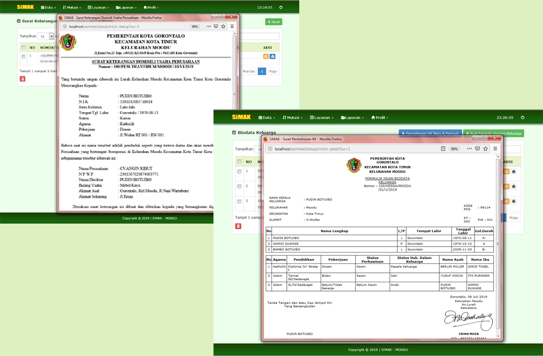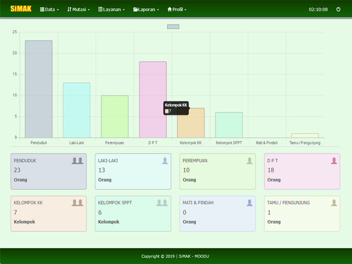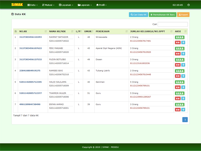 - Mengelola data KK seperti penambahan/permohonan KK baru, update anggota KK, update data nomor SPPT kelompok KK, update data lokasi peta kelompok KK yang semuanya itu terintegrasi langsung dengan system database penduduk.
