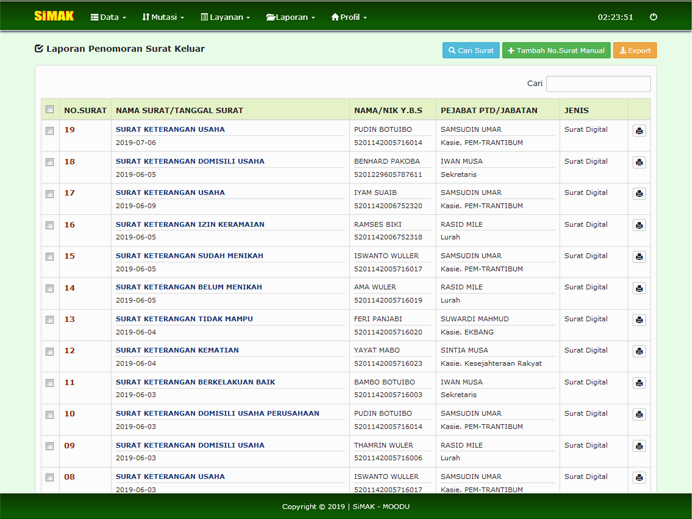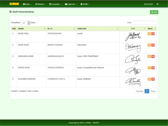 - Mengelola data staf pemerintahan desa/kelurahan seperti nama pejabat, nip, jabatan, gambar tanda tangan digital, dll.