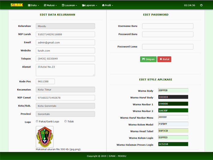 - Setingan style aplikasi seperti logo desa/kelurahan, background tampilan halaman depan aplikasi, warna template aplikasi, dll.
