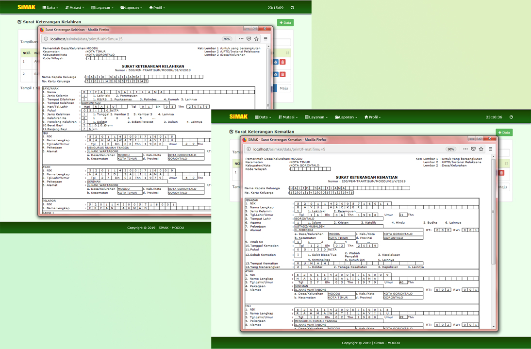 - Merekam & menyimpan data kelahiran, kematian, pindah penduduk & pengunjung (penduduk desa lain) yang terintegrasi langsung dengan system database penduduk.