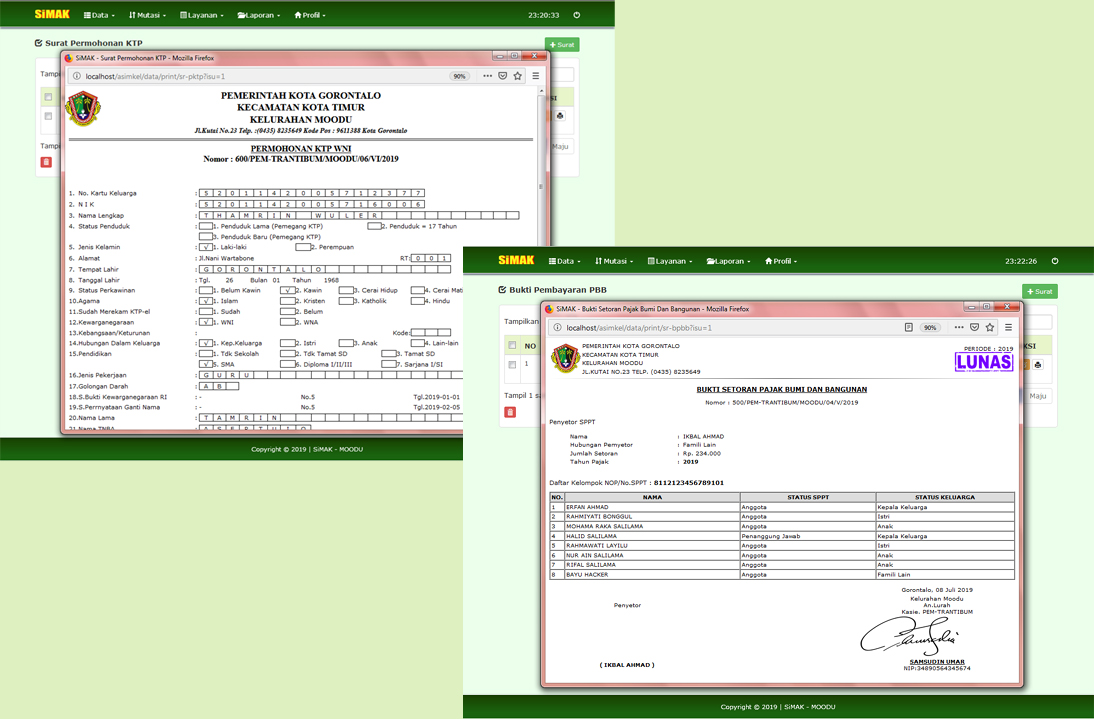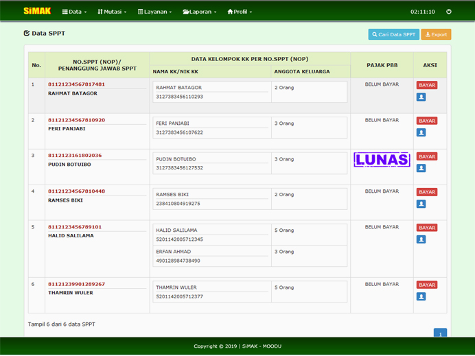 - Mengelola data SPPT seperti kelompok SPPT per KK, update status penanggung jawab SPPT, update status pembayaran PBB yang semuanya itu terintegrasi langsung dengan system database penduduk.
