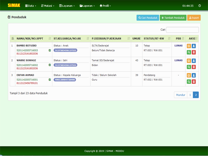 - Mengelola identitas penduduk dengan standar informasi kependudukan Indonesia seperti NIK, nama, umur, jenis kelamin, alamat, lokasi peta, RT/RW, status kawin, agama, pendidikan, pekerjaan, kategori cacat, penyakit, status rekam KTP, nomor KK, status hubungan keluarga, nomor SPPT, status SPPT, status PBB, dll.