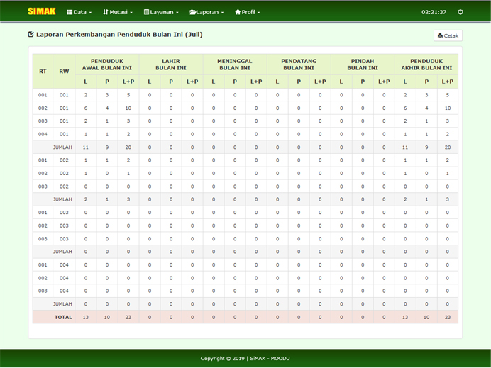 - Laporan perkembangan penduduk per RT/RW untuk 1 bulan.