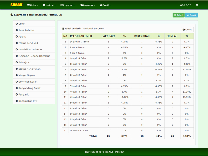 - Laporan data statistik tabel & grafik penduduk seperti umur, jenis kelamain, agama, status penduduk, pekerjaan, status perkawinan, golongan darah, penyandang cacat, dll.